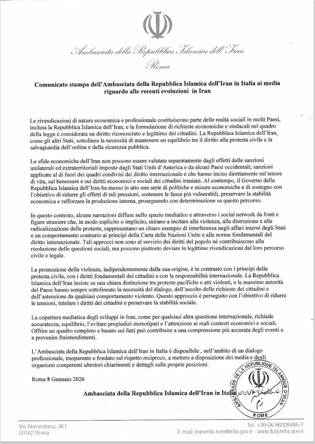 Comunicato stampa dell’Ambasciata della Repubblica Islamica dell’Iran in Italia ai media riguardo alle recenti evoluzioni in Iran