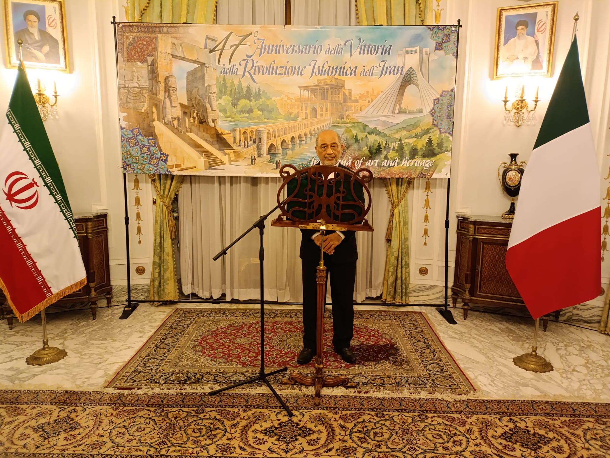È per me un grande onore essere oggi qui con voi in occasione del quarantasettesimo anniversario della vittoria della Rivoluzione Islamica dell’Iran. Desidero quindi ringraziare gli Ambasciatori e i rappresentanti delle missioni diplomatiche , le personalità del mondo politico e culturale, gli imprenditori e tutti i presenti.
