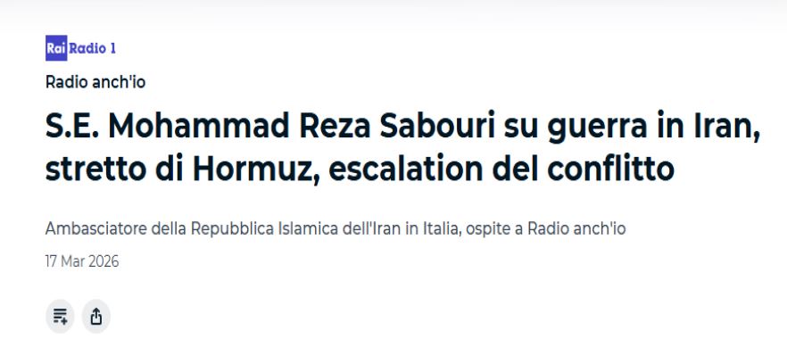 همانطور که روشن است، جنگ کنونی با تجاوز غیرقانونی و نامشروع آمریکا و رژیم صهیونیستی آغاز شده است. طبق پیام هایی که به طرق مختلف غیررسمی از شهروندان ایتالیایی دریافت میکنیم، افکار عمومی ایتالیا نیز به خوبی نسبت به دلیل تنشها و عامل آغاز این جنگ آگاهی دارند. در مورد حمله به پایگاه ایتالیا و برخی اهدف دیگر، هنوز منشا و عامل حمله مشخص نشده است. البته باید توجه داشته باشیم دشمن متجاوز که در عملیات نظامی خود برای تسلیم ایران شکست خورده است، با انجام عملیاتهایی علیه کشورهای ثالث مانند ترکیه و آذربایجان، تلاش دارد روابط ایران با این کشورها را تخریب نماید. در این رابطه، آمریکا یک پهپاد به نام «لوکاس» مشابه پهپاد ایرانی «شاهد» تولید کرده است. ممکن است حملات علیه پایگاه ایتالیایی نیز در این چارچوب باشد.